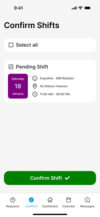Voor mijn werk in het distributiecentrum van de Kruidvat maaktte ik gebruik van de app Planbition om mijn planning in te zien en om shifts te accepteren. Ik ervaarde echter vaak problemen met deze app, hierdoor ging ik nadenken over wat ik persoonlijk zou veranderen aan de app. Vervolgens ben ik in Figma bezig gegaan met een herontwerp van de app.